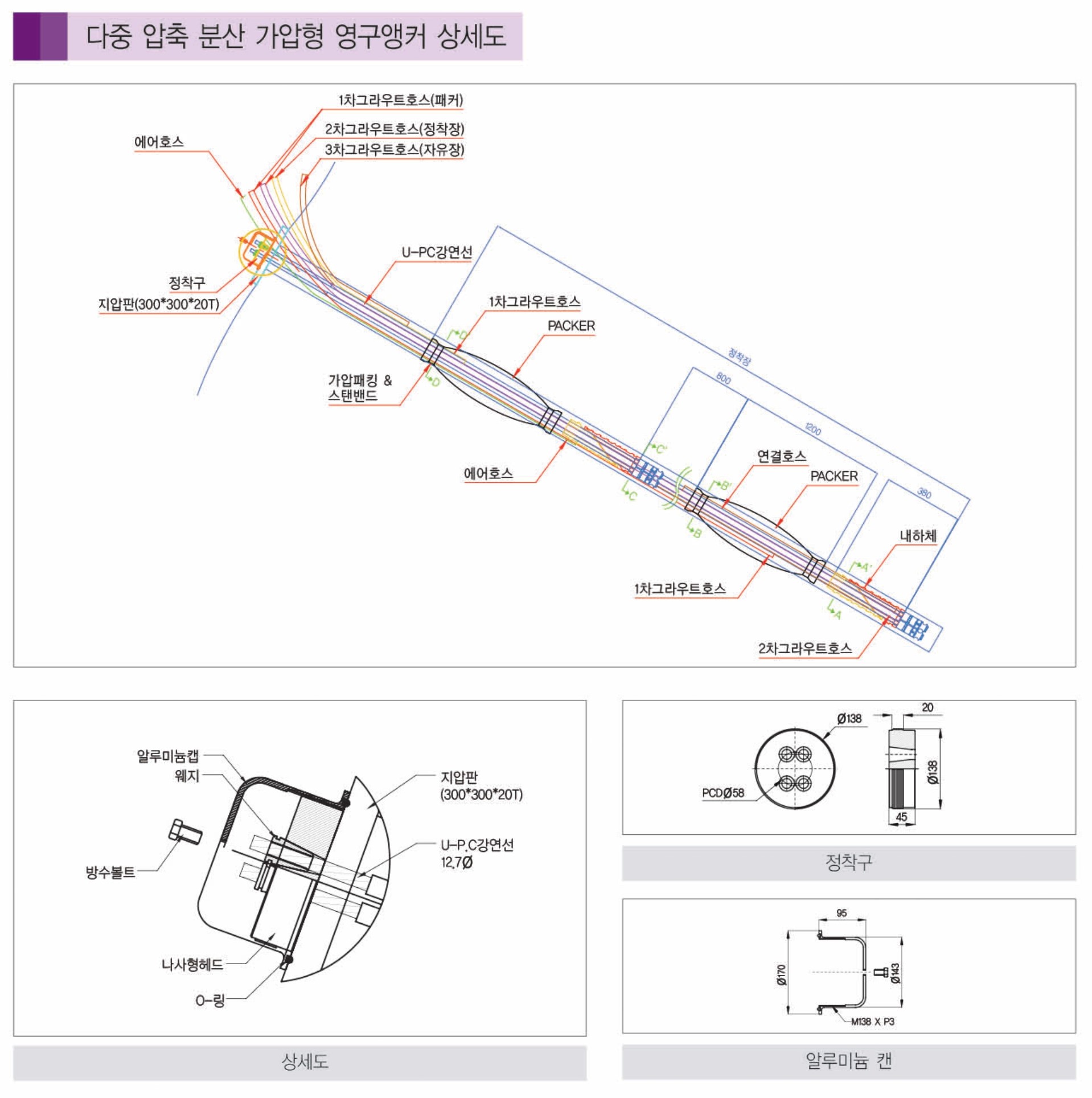마찰저항력이 작아 일반적인 앵커의 시공으로는 어려운 소요 인장력 확보가 어려운 지층에서 앵커 정착부 외부에 일정간격으로 설치된 팩을 가압 주입하여 주변지반을 압착시켜 마찰력증대와 구조물의 안정화를 도모한다.