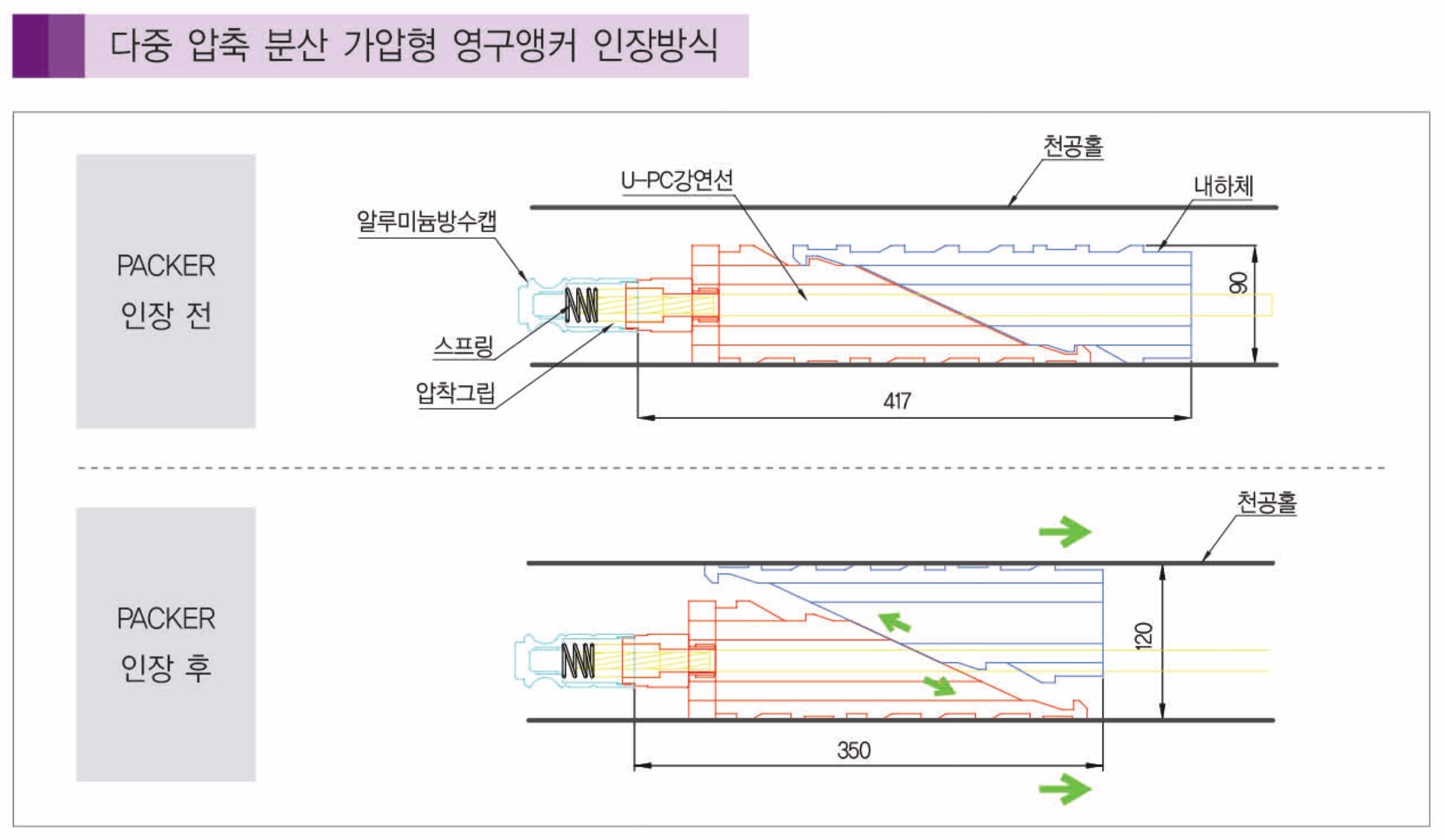 마찰인장형 영구앵커로, 조립된 앵커체를 천공홀에 삽입하고 그라우팅호스와 패커의 팽창가압을 통해 1차그라우팅하는 정착장확장단계와 이후 강연성 인장단계, 마지막으로 2차그라우팅 완료단계를 거친다.