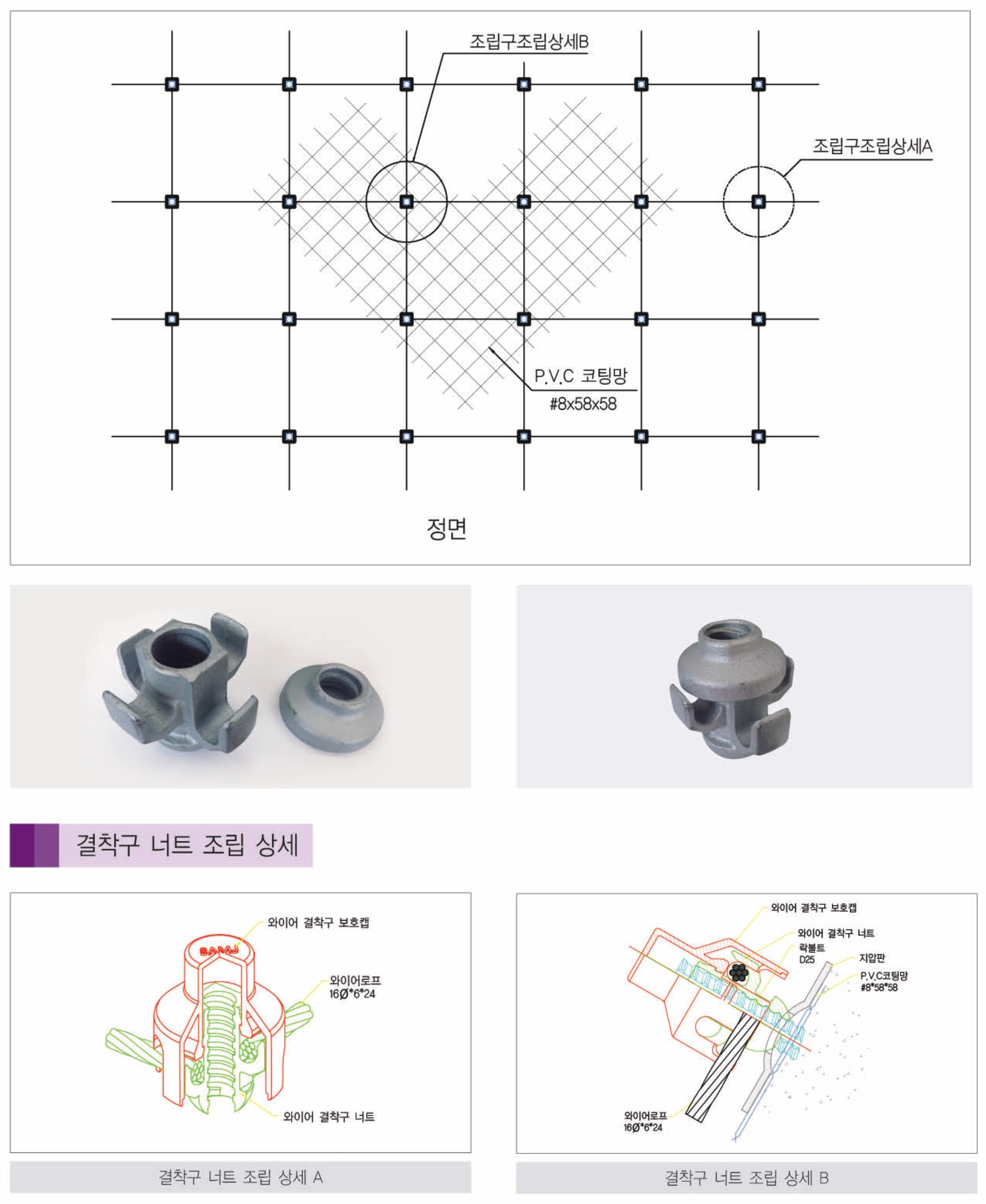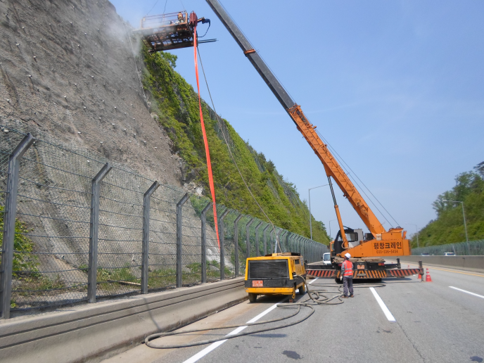 낙석방지망은 암 깎기 비탈면에서 낙석의 우려가 있는 연암 또는 돌이 섞인 토사구간에서 우수로 인한 세굴 등으로 돌, 소규모 암편의 낙하가 예상되는 장소에 설치하는 공법으로 타 공법에 비해 저렴한 공사비에 시공은 간단하고 공기가 짧다.